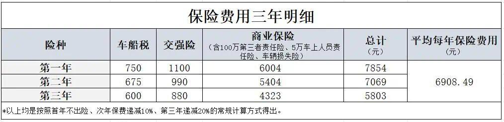 我咨询了几家保险公司,按首年不出险,后面保费逐年递减的常规情况算。这台车第一年保险稍微贵点,之后两年会降下来。三年平均下来,每年的保险费用大概在6900元左右。当然,这个数是个参考,你要是驾驶技术过硬常年不出险,或者有固定的保险渠道,实际还能再低点。